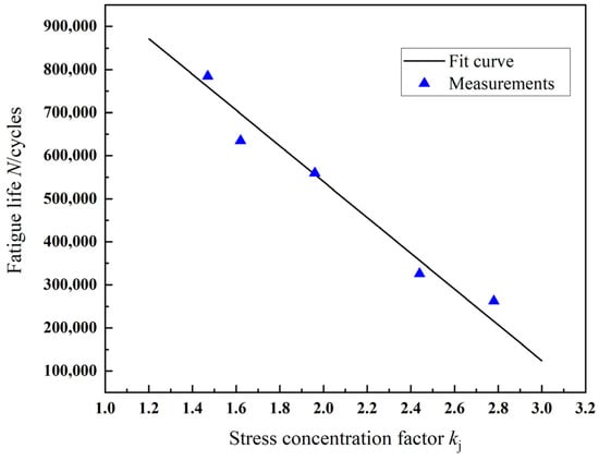 The structural stress concentration factor kj and fatigue life can be fitted into a linear function by using the least squares method, as shown in Figure 9.