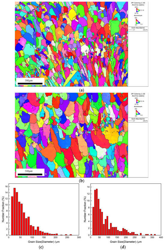 EBSD analysis was employed to investigate the grain distribution and microstructural properties of two sets of samples, as presented in Figure 6. The inverse pole figure maps, depicted in Figure 6a,b, revealed that, within the melt pools created by both fabrication modes, the grain growth was not predominantly unidirectional. Instead, there was a diverse mixture of equiaxed and columnar grains, with the majority tending to grow perpendicularly to the direction of additive deposition. Figure 6c,d show the distribution of grain sizes for the two sets of samples. For the samples produced using the STP mode, the average grain diameter was calculated to be 58.2 µm, with the range of its values extending from a minimum of 14.3 to a maximum of 269.1 µm. In contrast, the samples fabricated using the TP mode exhibited a larger mean grain diameter of 80.6 µm, with its values ranging from 14.3 to 361.9 µm. These results suggested a coarser grain structure produced by the TP mode compared to that obtained by the STP mode. Reference [33] indicated that the natural frequency of the droplet increases with a decrease in droplet size. In STP mode, more small droplets are transferred to the melt pool, thereby changing the oscillation frequency of the melt pool. The finer grain size observed in the STP mode samples was postulated to result from the unique oscillatory motion imparted on the melt pool, despite maintaining a constant welding current and voltage for both modes. An analysis of the pole figures indicated that the STP samples exhibited lower texture strength, with a maximum value of 2.73, whereas the TP samples displayed more significant texture intensity, peaking at 3.70. These data suggested that the utilization of the STP mode during the additive manufacturing of 5356 alloy served to reduce the textural strength, which could reduce the anisotropy in the mechanical properties of the material.