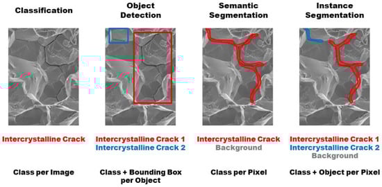 In microstructure analysis, ML tasks, derived from CV tasks, usually fall under the following categories [16], as visualized in Figure 1: