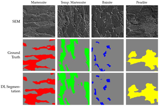 For SEM images, in terms of the number of correctly classified second-phase objects, an outstanding classification accuracy of 94% was achieved, which significantly outperformed previous state-of-the-art methods. In terms of pixel accuracy and mean intersection over union (mIoU), values of 93.9% and 67.9% were achieved, respectively. An excerpt of the results can be seen in Figure 2. For LOM images, the object classification accuracy amounted to only 70.1%, which is, considering the complexity of microstructures, still a good result, but also clearly shows the limitations of LOM in resolving fine, similar microstructures like bainite, martensite and tempered martensite. Overall, the proof of concept was highly successful, especially considering the novelty of DL technologies in MSE at the time.