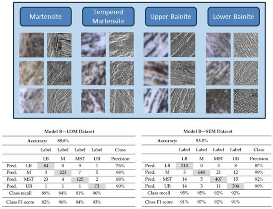 Illustration of the considered classes for microstructure classification (corresponding light optical microscope (LOM) and scanning electron microscope (SEM) images) as well as confusion matrixes for LOM model and SEM model, modified according to [30]. Reprinted from [30].
