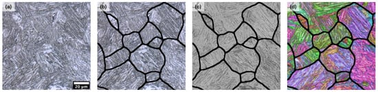 Hot-forming or any type of temperature treatment during steel production generally occurs in the high-temperature phase, that is, austenite. The development of both the austenite grain size during these processes and the resulting austenite grain size are highly significant for the final steel product because they influence the type and properties of the final microstructure, e.g., phase transformation behavior such as bainite or martensite formation or final grain size [46]. Additionally, knowledge about austenite grain evolution is important for understanding and optimizing associated process like thermomechanical controlled processing or alloy designs [91]. Considering the microstructure of the final steel product, since austenite transforms into different room temperature phases upon cooling, the prior austenite grain (PAG) size cannot readily be measured but requires reconstruction [46,92].
