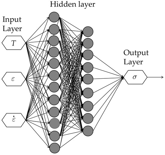 For various decades, medium carbon microalloyed steels have been used in the manufacturing of industrial parts. These steels are basically C-Mn steels with additions of conventional microalloying elements such as aluminum (Al), vanadium (V), titanium (Ti) or niobium (Nb). These microalloying elements contribute to improving the mechanical properties of these steels by both grain size refinement and precipitation hardening during component cooling after hot forming, without the need to use heat treatment processes, which is interesting for several industrial applications [1], such as automotive [2] or railway transportation applications [3]. Unfortunately, due to the complex relationships involved in hot forming process modelling and the non-linearity of their flow behavior, there are very few works in the literature using artificial neural networks (ANNs) to predict the flow behavior of medium carbon microalloyed steels during the hot forming process. ANN algorithms are recognized as among the most powerful algorithms in alloy design included in Machine Learning (ML) techniques [4]. Shina et al. [5] stated that methods to minimize experiments to predict mechanical properties based on ML techniques are interesting for the industry, so they developed an ANN for microalloyed steel for the hot rolling–direct strip combined process. Pan et al. [6] compared five ML algorithms (which included ANNs) for a Ni-Cr-Mo low-alloy steel to predict flow stress. Ghazani developed an efficient ANN to predict the flow behavior of Ti-Nb microalloyed steel during hot torsion deformation [2].