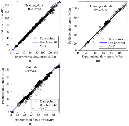 Comparison between the experimental flow stress and that obtained by the ANN for studied steel: (a) training; (b) validation; (c) testing.
