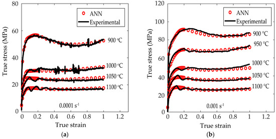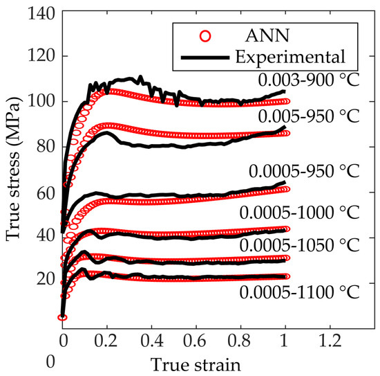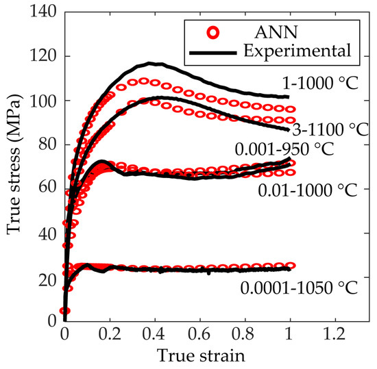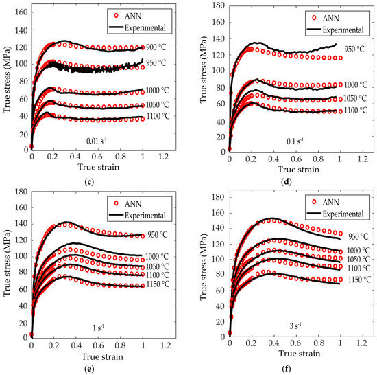 Figure 5 represents the experimental flow curves (in black) and those obtained by the ANN after the training and validation phases (in red) for different temperatures. Figure 6 represents the experimental flow curves (in black) and those obtained by the ANN after the training, validation and testing phases (in red) for different strain rates. It can be seen in Figure 5d that the experimental flow curve at 950 °C and = 0.1 s−1 shows a small increase in stress from due to the frictional effects, as explained in Section 2.1. Figure 7 and Figure 8 represent the flow curves for the temperatures and strain rates used for the ANN validation and testing phases, respectively.