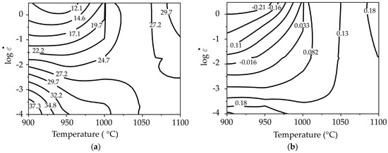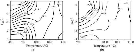 In Figure 9, the processing maps based on the VDMM are represented. These maps reveal a domain of plastic instability between 900 and 950 °C and high strain rates of 3 s−1; this domain coincides with the domain found in the DMM maps. Despite the small difference found in the position of the stable domains, good agreement is observed between the different processing maps built based on the two models, the DMM and the VDMM.