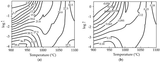 In relation to the plastic instability [19] map based on the DMM, as is known, the greater the negative magnitude of the plastic instability parameter (ξ), the greater the possibility of the appearance of some manifestation of plastic instability. Thus, in order to always form under stable flow conditions, domains of possible instabilities must be avoided during hot forming processes. The map represents two zones of stability; one for a temperature of 900 °C and a strain rate of 0.0001 s−1 and the other for 1100 °C at 3 s−1.