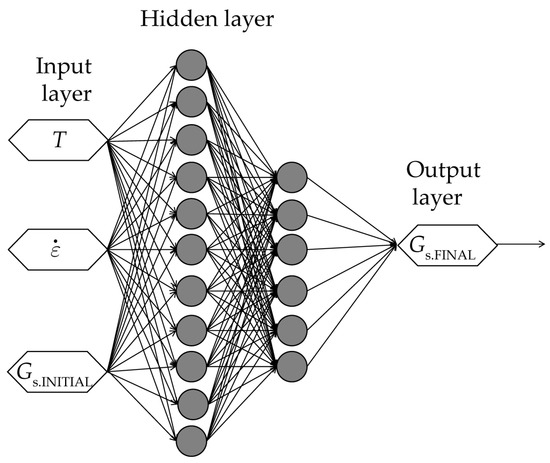 In the same way as in the previously developed ANN model, temperature and strain rate were normalized to values between 0 and 1. Grain size values do not need to be normalized. The ANN model is the same as the one previously developed used to determine the flow curves, that is, the Multi-Layer Perceptron (MLP) based on Feed-Forward and backpropagation (BP) as a learning algorithm. For training, the Levenberg–Marquardt (trainl) algorithm is applied, based on the backpropagation (BP) learning algorithm.