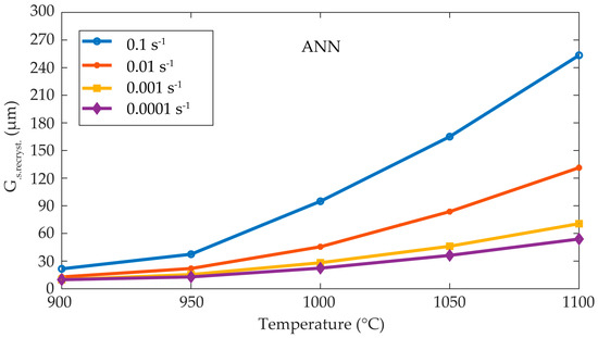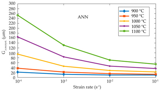 The results obtained by the ANN can be compared with the experimental results shown in Figure 13 and Figure 14. In these figures, it is clearly observed that the range of high temperatures and very low strain rates exhibit grain growth, and as the strain rate increases, the grain is refined. In this case, the initial grain size is different at each temperature.