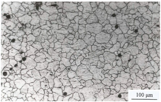 The interpretation of the domains that appear in the processing maps of the studied microalloyed steel can be performed by using the flow curves associated with each domain, as well as the evolution of grain size with temperature and strain rate. Therefore, the broad domain, observed in the processing maps, located at low strain rates represents single-peak dynamic recrystallization in the temperature range between 900 °C and 950 °C, while at higher temperatures (950 °C), this same domain is representative of cyclic dynamic recrystallization. The domain located at high strain rates and high temperatures represents the process of single-peak dynamic recrystallization. The microstructure of the specimens deformed at T = 1100 °C and = 0.3 s−1, as represented in Figure 15 [19]. In these microstructures, it is noteworthy that considerable reconstitution of the microstructure due to DRX processes and perhaps also additional post-dynamic processes is evident.