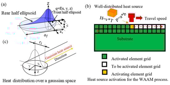 The activation method of a heat source plays a crucial role in numerical simulation, especially for WAAM. In the literature, the quiet element and inactive element methods are the two most used for the simulations of the WAAM process [27,28]. In the quiet and inactive element method, the filler metal element is present throughout the entire simulation, but quiet values are initially assigned to its thermal and elastic properties. These properties transition progressively from quiet to active values based on the element temperature. For large components, the continual presence of the filler metal elements throughout the entire process can result in long computation times. To address this issue, the death-and-birth element method is combined with the well-distributed heat source model to simulate the WAAM process in this study. As displayed in Figure 2b, the displacement of the arc heat source and the deposition of the molten filler wire metal on the substrate are achieved through the gradual activation of new elements in each time step. During a time step , nodes within the current grid element are selected, the physical attributes are assigned, and the well-distributed volumetric heat source is applied to the activated grid element. In the subsequent time step, the heat source model moves to the next grid element along the deposition path, the heat source of the previous element grid is removed, and the new grid element is activated through assigning physical attributes. This sequential activation (birth) and deactivation (death) of volume elements along the deposition path mirror the actual deposition process, enhancing the fidelity of the simulation.
