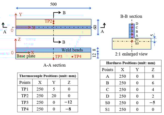 The results of a WAAM experiment conducted by Ding [21] were used to validate the accuracy of the thermal simulations using various heat source models. As shown in Figure 3, a beam structure with a width of 5 mm was built along the center line of a baseplate using a moving heat source. The traverse speed of the torch was set at 0.5 m/min (8.33 mm/s), and a single path of the heat source along the longitudinal direction was performed for each layer with a thickness of 2 mm. The base plates used in the experiments were rolled structural steel plates (grade S355JR-AR). The chemical composition of the alloy (in wt.%) is 0.24% C, 1.60% Mn, 0.55% Si, 0.045% P, 0.045% S, 0.009% N, 0.003–0.100% Nb, and Fe balance. The chemical composition of the solid wire (in wt.%) is 0.08% C, 1.50% Mn, 0.92% Si, 0.16% Cu, 60.040% P, 60.035% S, and Fe balance. The cooling time after the deposition of each layer was 400 s to mitigate the thermal distortion and residual stress. The heat input for the welding process was 269.5 J/mm, assuming an efficiency of 0.9. Additionally, four K-type thermocouples (TP1, TP2, TP3, and TP4) were spot-welded at the positions indicated in Figure 3 to record the temperature variation at these positions during the WAAM process.