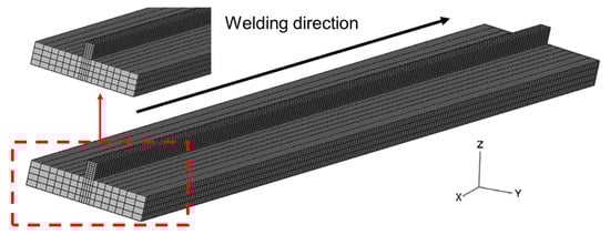 Based on the geometry of the WAAM sample illustrated in Figure 3, the finite element-based thermal transfer model was developed using Abaqus CAE 2019. The mesh configuration is illustrated in Figure 4. Linear brick elements with eight nodes (DC3D8) are used for thermal simulations. The determination of the mesh size and time increment was carefully carried out to ensure numerical convergence. To accurately capture the thermal performance around the heat source, a dense mesh with elements of size was used for the weld beads and the vicinity near the welding line. The mesh was coarser in the y and z directions away from the welding line. With regard to the well-distributed heat source model simulation, the cross-sectional area of the activated grid element is considered as a constant value. This is motivated by the observations of Ding et al. [22] that the well-distributed heat source model is insensitive to the mesh, demonstrating its significant advantage with respect to the computational time.
