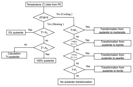 First, the temperature data is calculated from a thermal FE analysis, and the derivative of temperature with respect to time is used to distinguish between the heating and cooling stages. For a positive value (i.e., heating), and when the peak temperature falls within the range from to , all phases (ferrite, martensite, bainite, as well as pearlite) undergo a transformation into austenite, following a linear rule (see Equation (5)). If temperatures surpass , these phases will be fully transformed to austenite. For a negative value of the derivative of the temperature, the peak temperature will gradually decrease. During this cooling process, when the temperature reaches the start temperature of either bainite, martensite, pearlite, or ferrite phases, the austenite is considered to transform to these phases. Once reaching the judgment criterion based on the phase transformation temperature and the incubation time, the phase transformation from austenite to bainite and pearlite occurs following a linear rule. The transformation from austenite to martensite follows the JMAK equation.