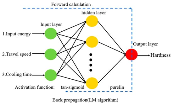 A basic artificial neural network comprises an input layer, multiple hidden layers, and an output layer. The network is basically a web where information flows from each input to every neuron in the first hidden layer. This information further propagates until it reaches the output layer. Connections between inputs–neurons–outputs are established using weights and biases. The complex behavior of the neurons is controlled using an activation or transfer function. The hidden layer contains numerous neurons which are to be trained, tested, and validated with various data points. In this study, the dataset (as defined in Table 2) serves as the basis for the neural network model. It has to be noted that neural network models have been successfully developed using a small dataset whilst obtaining a high prediction accuracy, as for example demonstrated in the work presented in [19]. Therefore, a back propagation neural network structure with a single output is applied in this work as shown in Figure 6. Similar to Section 2.3, the input energy, travel speed, and cooling time are taken as the input parameters of the ANN model. The hardness at the center line of different layers, i.e., the green solid points shown in Figure 6, is defined as the output parameter.