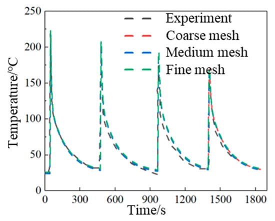 Comparison of the temperature–time curves for the three mesh configurations with experimental values.
