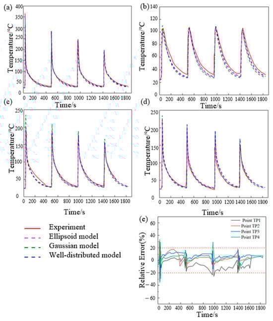 (a–d) Comparison of the experimental (Reprinted with permission from Ref. [21]. 2024 Elsevier) and numerical temperature history results for three different heat source models; (e) relative errors of the temperature history results of the well-distributed volumetric heat source model compared to the experimental results.