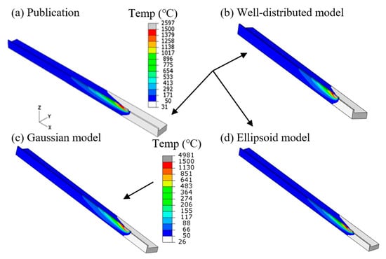 Temperature distribution from: (a) publication (Reprinted with permission from Ref. [21]. 2024 Elsevier); (b) the well-distributed heat source model; (c) the Gaussian heat source model; (d) the double-ellipsoid heat source model.