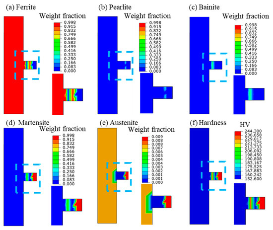 Distribution of the (a–e) phases at the mid-section: ferrite, pearlite, bainite, austenite, martensite; and (f) hardness.