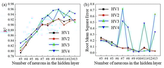 As discussed in Section 2.4, the number of neurons in the hidden layer varied from 3 to 13. The corresponding performance metrics R2, RMSE, and MAPE were calculated and are shown in Figure 14. Based on the maximum R and minimum RMSE values, the optimal number of neurons in the hidden layer for determining hardness was determined to be 10. Therefore, the ANN models for HV1, HV2, HV3, and HV4 are developed using a 3-10-1 network architecture unless specified otherwise. The values of the performance metrics are summarized in Table 6.