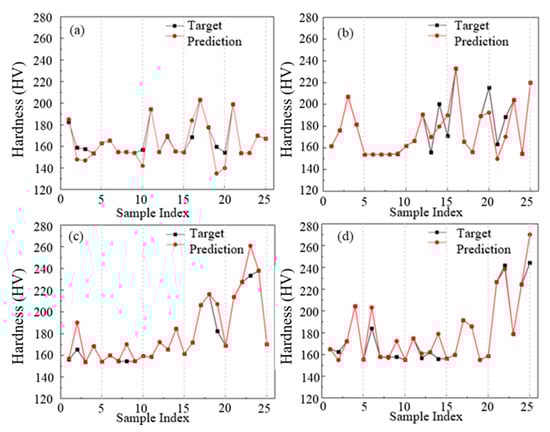 Target values and ANN predicted values of (a) HV1, (b) HV2, (c) HV3, (d) HV4.