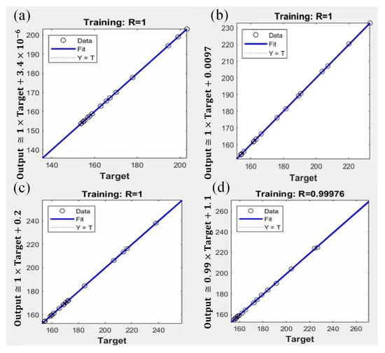 In this study, back propagation ANNs with the selected architecture were developed. A comparison of the target values and prediction results obtained for HV1, HV2, HV3, and HV4 is shown in Figure 15. In most conditions, the same values are obtained for the targets and predicted results. The maximum relative errors of HV1, HV2, HV3, as well as HV4, are within ±20%. These observations are the first evidence of the ANN model performance. Additionally, the performance is analyzed based on the , , and metrics which are reported in Table 6. The values for the ANN estimations are 2.4% for HV1, 2.5% for HV2, 1.8% for HV3, and 2.0% for HV4. The results confirm that the ANN yields a high prediction accuracy for hardness for the range of simulated process parameters. In addition, the training of neurons reveals a high correlation for the output parameters HV1, HV2, HV3, and HV4 (Figure 16). Based on the above results, it can be concluded that the ANN model shows a good prediction performance for the studied set of numerical experiments.