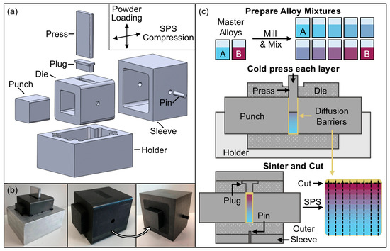Based on this modeling, tooling was designed for a 25 × 25 × 5 mm sintering volume that could be loaded orthogonally to the SPS compression axis (Figure 2a). For loading, the graphite tooling rests in a holder that holds the punches flush with the press so that the sintering volume is defined by the punch faces and die wall (Figure 2b). Alloy mixtures corresponding to each layer are sequentially loaded into the sintering volume through the plug opening, leveled, and cold pressed. After the final layer is added, the plug, outer sleeve, and pin are assembled, in that order, for sintering (Figure 2b,c). The outer sleeve secures the plug and provides added strength to the assembly at the expense of a larger cross-sectional area and reduced heating efficiency.
