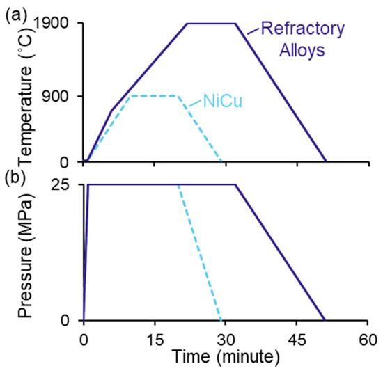 The samples were sintered in a rough vacuum (0.2 Pa). The applied force was first ramped to apply 25 MPa to the sample during the first minute before heating at 100 °C/min to 900 °C for NixCu1−x or to 1900 °C for the refractory systems (Figure 3). The temperature measurement for the NixCu1−x samples used a K-type thermocouple inserted into a hole in the graphite die. For the refractory metals, a pyrometer was focused into a small hole drilled through the outer sleeve and into the inner die. Due to limitations of pyrometer measurement at low temperatures, the initial heating to 700 °C used manual power control. The samples were held for 10 min at the sintering temperature before cooling at 100 °C/min. The pressure was ramped down linearly over the cooling period.