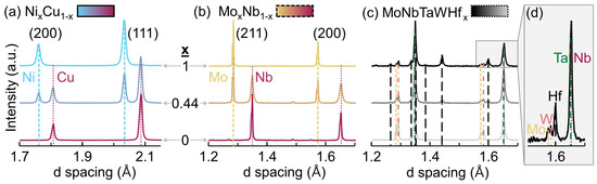 Figure 4 shows XRD patterns for the endmembers and one representative intermediate mixture (x = 0.44) for each gradient. For the Ni-Cu system (Figure 4a), the patterns for the pure metals are consistent with the FCC reflections of Ni and Cu, respectively, and the Ni0.44Cu0.56 pattern shows reflections for both components. Likewise, the patterns for pure Mo and Nb (Figure 4b) are consistent with the expected BCC reflections, and the Mo0.44Nb0.56 pattern shows both sets of reflections. The alloy mixtures of the MoNbTaWHfx system (Figure 4c) produce reflections for the elemental constituents (BCC, except for the HCP Hf present for x = 0.44 and 1). Separate reflections corresponding to the lattice parameter for each metal component are evident, suggesting that there is limited mechanical alloying during milling (Figure 4c,d).