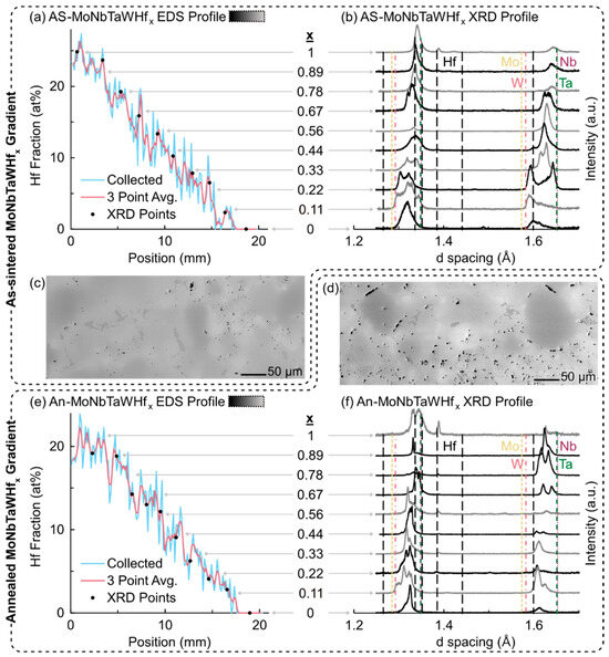 (a) EDS and (b) XRD profiles of as-sintered MoNbTaWHfx gradients. SEM micrographs of the gradient (c) after sintering and (d) after annealing at 1800 °C for 24 h. Similar (e) EDS and (f) XRD profiles of the annealed MoNbTaWHfx gradients.