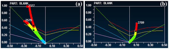 Figure 3 presents the transition diagram of the maximum principal strain path corresponding to the specimen when the plate widths are 20 mm and 180 mm. It can be observed that when the plate width is small (less than 100 mm), there will be no inflection point in the strain path of the maximum principal strain, as shown in Figure 3a. When the second principal strain value is almost unchanged, but the maximum principal strain value increases sharply in a vertical shape, the stress state changes to a plane stress state, and the strain corresponding to the inflection point is the limit strain value, as shown in Figure 3b.
