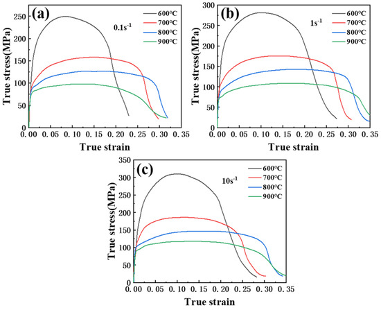 The 22MnB5 steel stress–strain curves under different experimental conditions: (a) strain rate = 0.1 s−1; (b) strain rate = 1 s−1; (c) strain rate = 10 s−1.