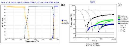 Equilibrium transition diagram and CCT of 22MnB5 steel. (a) The equilibrium transition diagram; (b) CCT curve.
