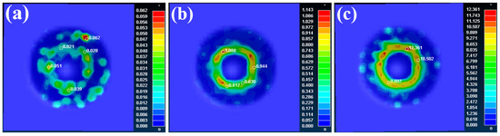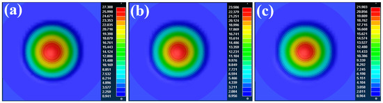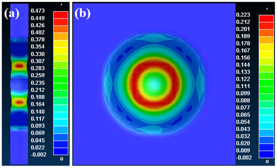 Nephogram of displacement corresponding to 22MnB5 steel under different forming speeds: (a) 2.5 mm/s; (b) 25 mm/s; (c) 250 mm/s.