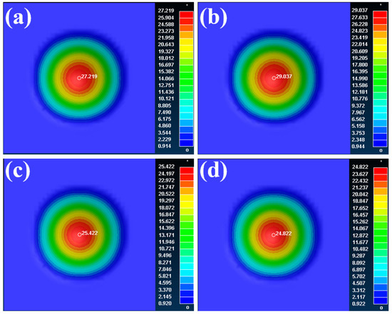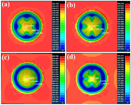 Nephogram of the temperature field corresponding to 22MnB5 steel under different initial deformation temperatures: (a) 600 °C; (b) 700 °C; (c) 800 °C; (d) 900 °C.