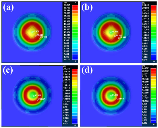 Figure 12 is the cloud chart of the thinning rate corresponding to the critical fracture time at different initial deformation temperatures. It can be seen that the maximum thinning rate corresponding to different initial forming temperatures at the critical fracture time was 27.061%, 31.240%, 28.231% and 24.752%, respectively, which was the same as the law of downforce displacement. It increased with the increase in the initial deformation temperature of the plate. The greater the downforce displacement, the greater the thinning rate. The thinning rate reached the maximum at 700 °C. Thereafter, the thinning rate decreased with the increase in the initial deformation temperature of the plate. The area with the largest thinning rate was located around the contact center between the punch and the plate. Combined with the analysis of the temperature field nephogram, it was found that the area with the most serious thinning was located in the area with uneven temperature distribution.