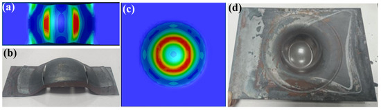 Comparison chart of the maximum principal strain nephogram and plate state after experiments with different plate widths: (a) 60 mm; (b) 60 mm; (c) 180 mm; (d) 180 mm.