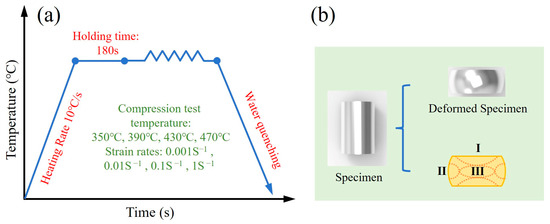 The specimens were heated at a rate of 10 °C/s to different deformation temperatures, then held for 3 min to eradicate temperature gradients, thus ensuring uniform temperature distribution internally and externally. Following this, the specimens underwent single-pass compression deformation under varying conditions (temperatures: 350 °C, 390 °C, 430 °C, and 470 °C; strain rates: 0.001 s−1 to 1 s−1) utilizing the Gleeble-3800 thermal simulation testing machine (Poestenkill, NY, USA). After deformation, the specimens were promptly water-cooled to retain their microstructure resulting from the high-temperature deformation. Throughout the deformation process, the testing machine system recorded data such as load, displacement, deformation temperature, etc., and automatically calculated the true stress and the true strain through the program. The specific deformation experimental procedures are illustrated in Figure 1.