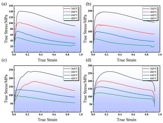 Stress–strain curves of Mg-13Gd-4Y-2Zn-0.5Zr alloy under various deformation conditions: (a) 0.001 S−1; (b) 0.01 S−1; (c) 0.1 S−1; (d) 1 S−1.