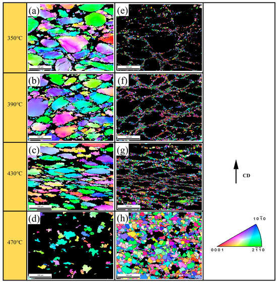 The influence of different temperatures at 0.001 S−1 on the dynamic recrystallization microstructure of Mg-13Gd-4Y-2Zn-0.5Zr alloy: (a,e) 350 °C; (b,f) 390 °C; (c,g) 430 °C; (d,h) 470 °C. Herein, CD denotes the compression direction, where (a–d) represent the parent phase grains under corresponding temperatures, while (e–h) denote dynamically recrystallized grains matching them.