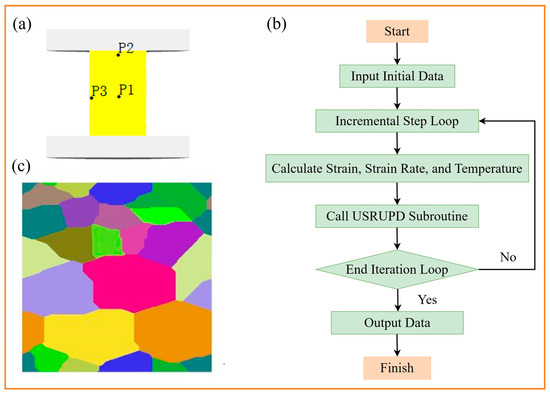 DEFORM-3D facilitates users in defining the plastic flow behavior of materials by inputting rheological stress data under various process conditions. In this investigation, a rheological stress model was selected. Utilizing available experimental data, multiple data points at different temperatures and deformation rates were carefully selected and evenly distributed to ensure precision. These data points were then entered into the software’s data table, and the software automatically interpolated them to generate stress–strain curves. Subsequently, upon accessing the sub-menu, each physical property parameter of the material was systematically and meticulously included and stored, thereby establishing the alloy’s material repository. Through analysis of the results of the hot compression experiments, the various models mentioned earlier were calculated. Furthermore, the user subroutine of DEFORM-3D underwent further development, wherein the relevant models were incorporated into the software’s subroutine using the FORTRAN 11.0 language. The computational procedure of the dynamic recrystallization subroutine within the software is depicted in Figure 6b.