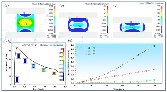 Finite element simulation of the thermal deformation process. (a–c) Equivalent strain cloud maps at different stages of deformation. (d) Cloud maps of dynamic recrystallization volume fraction at different stages of deformation. (e) Variation curves of equivalent strain at different characteristic points over simulation time steps.
