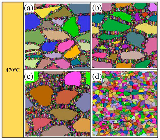 Microstructure after deformation simulated by cellular automaton at different temperatures: (a) 350 °C; (b) 390 °C; (c) 430 °C; (d) 470 °C.