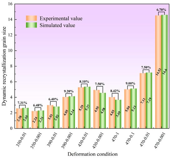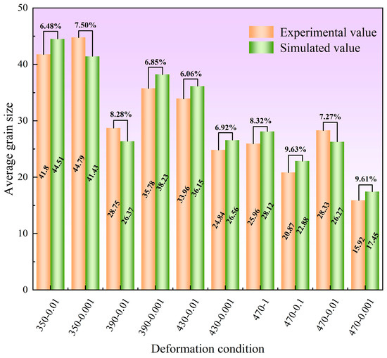 The average grain size is also highly sensitive to both the deformation temperature and strain rate. However, their respective influences on the average grain size were rather intricate (Figure 12). In the absence of complete dynamic recrystallization, as the deformation temperature rose, the average grain size gradually decreased, while, with increasing strain rate, the average grain size gradually increased. Conversely, in cases where complete dynamic recrystallization occurred partially, multiple scenarios of average grain size variations were observed with changes in the deformation temperature and strain rate. It is worth noting that Figure 10, Figure 11 and Figure 12 delineate the comparison between the simulated and experimental values of the dynamic recrystallized grain size, dynamic recrystallization volume fractions, and average grain size under various processing conditions. The figures reveal a maximum disparity of 12.39% and a minimum disparity of 6.06%. This finding emphasizes the significant concordance between the simulated outcomes and the experimental data, affirming the robustness of the cellular automaton (CA) model devised to depict the microstructural changes in rare-earth magnesium alloys during thermal deformation. This model was refined through the secondary development of the user subroutine in the finite element software DEFORM-3D.