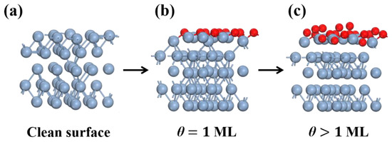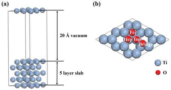 Four adsorption sites of O atoms are considered in Figure 1b. The average adsorption energy per O atom on the Ti(0001) surface, denoted as , is calculated as follows [26]: