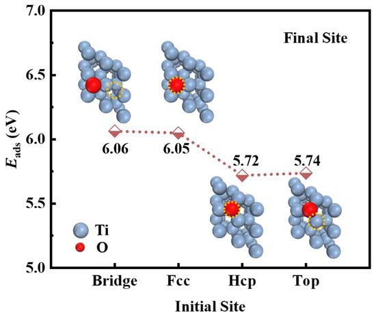 The Eads at different O-adsorbed sites are presented in Figure 2. Initially, the position of the O atom was found to be unstable at the bridge and top sites, while it was stable at the Hcp and Fcc sites. The Eads of the O atom at the Fcc site (approximately 6.06 eV) exceeded that at the Hcp site (approximately 5.72 eV), indicating that the O atom was most stable at the Fcc site. This observation was consistent with previous studies [14,27]. Consequently, the Fcc site was selected for O atom adsorption in the subsequent calculations.