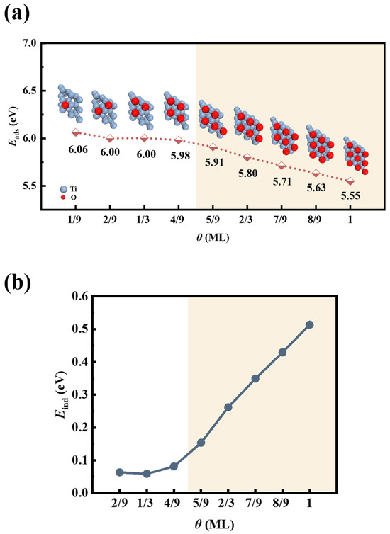 Figure 3 illustrates the variations in and of the O-adsorbed Ti(0001) surface with different θ. Positive values, as depicted in Figure 3a, signified that O adsorption was exothermic and hence thermodynamically favorable. The Ti(0001) surface readily adsorbed the highly electronegative O atoms, resulting in longitudinal Ti-O interactions. In Figure 3b, the positive values increased significantly with increasing θ, thereby amplifying the electrostatic repulsion and electrostatic energies between the O atoms. Consequently, the horizontal repulsion between O atoms increased with , while decreased. Similar observations were made for O adsorbed on other metallic surfaces [29]. Notably, at high θ (), the values exhibited a sharp increase (refer to the orange transparent area in Figure 3b), indicating a significant rise in repulsion between O atoms. This may also have led to a sharp decline in (refer to the orange transparent area in Figure 3a).