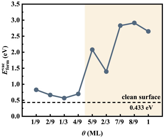 The calculated of a Ti vacancy under different θ. The orange transparent areas denote the region of higher oxygen coverage (θ = 5/9–1 ML).