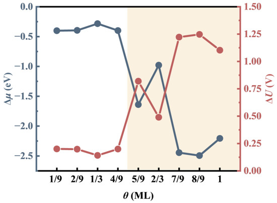 Δµ and ΔU of the O-adsorbed Ti(0001) surface compared with the clean surface under different θ. The orange transparent areas denote the region of higher oxygen coverage (θ = 5/9–1 ML).