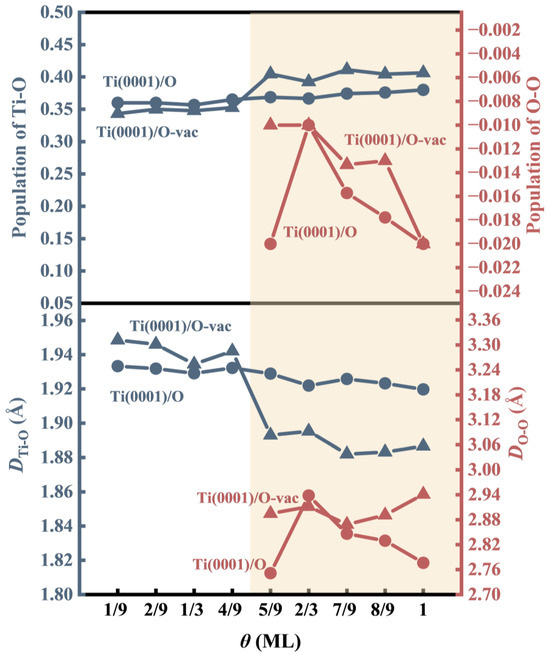 To explore the influence of Ti vacancy on the geometric structure of the Ti(0001) slab, the geometric structural parameters of the Ti-O slab are presented in Figure 7. In Figure 7b, denotes the vertical distance between O and surface Ti atoms, while represents the bond length of the Ti-O bond. Both and are averages. It is evident from the data that both and values decreased with increasing θ. Specifically, the values of the Ti(0001)/O-vac slab were smaller than those of the Ti(0001)/O slab. Similarly, the values of the Ti(0001)/O-vac slab were less than those of the Ti(0001)/O slab at high θ (), as indicated in the orange transparent area. This suggested a strengthening of the Ti-O bonds with increasing O adsorption, with the enhancing effect of a Ti vacancy on the Ti-O bonds becoming more pronounced when the adsorbed O atom was close to the monolayer.